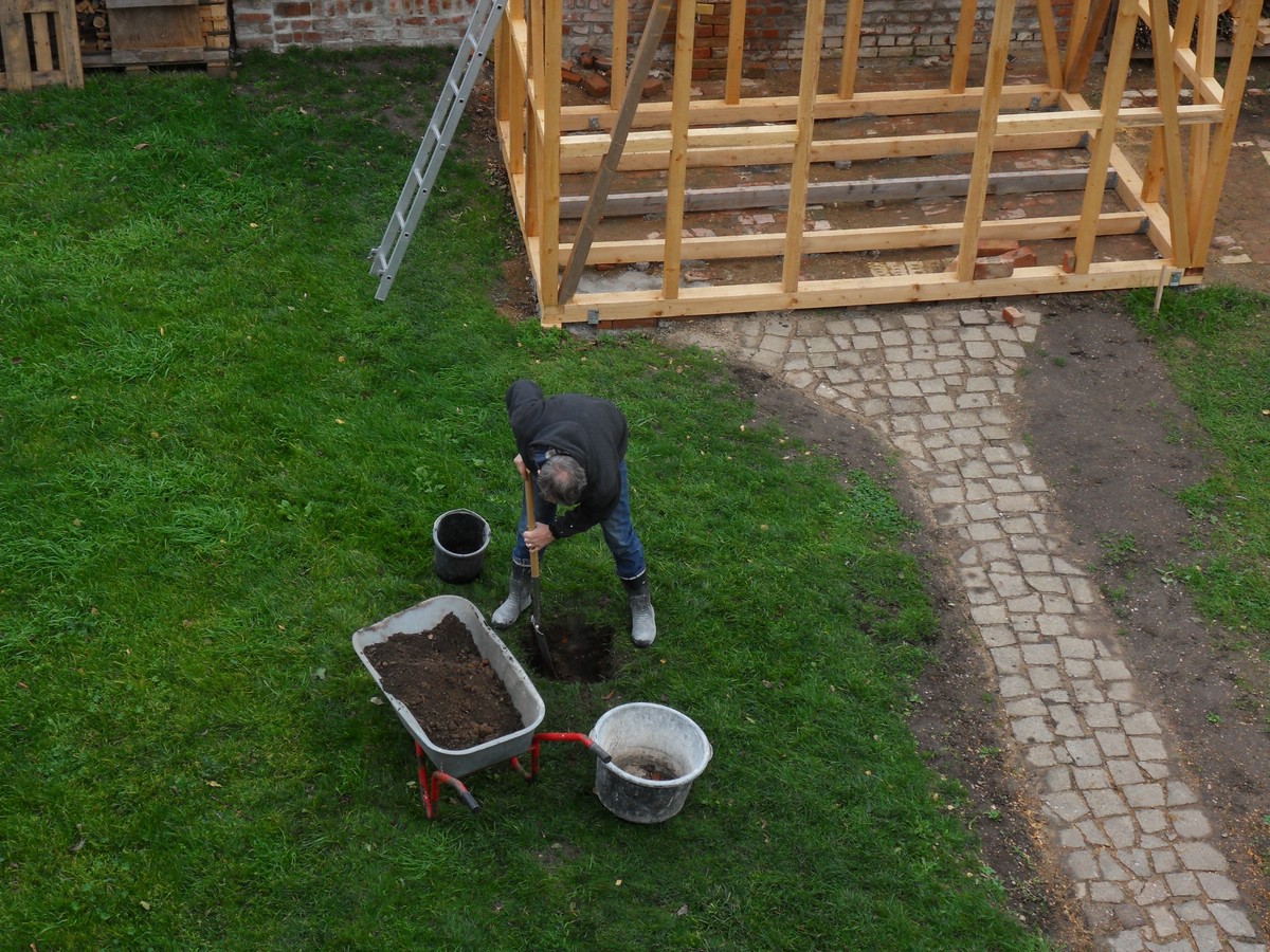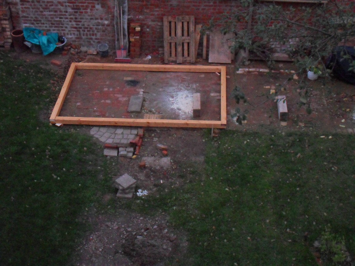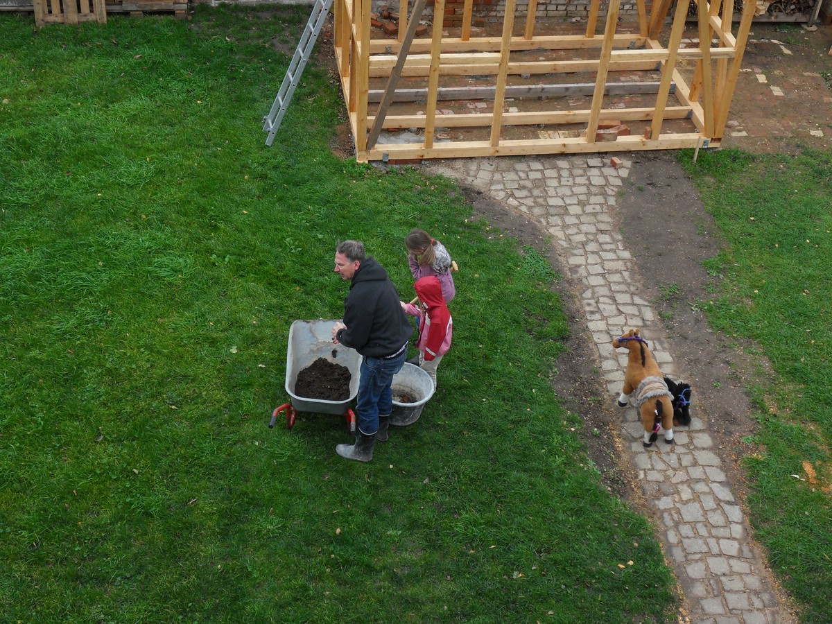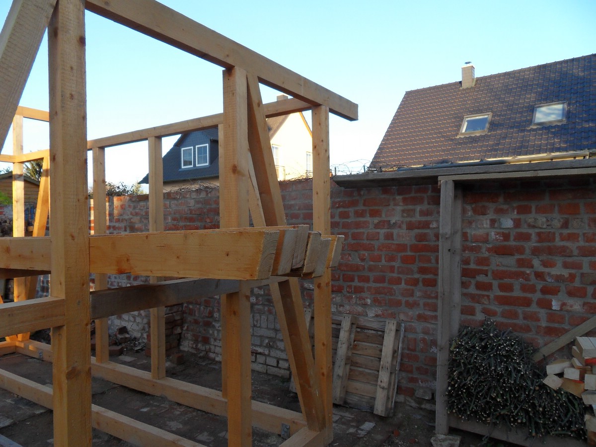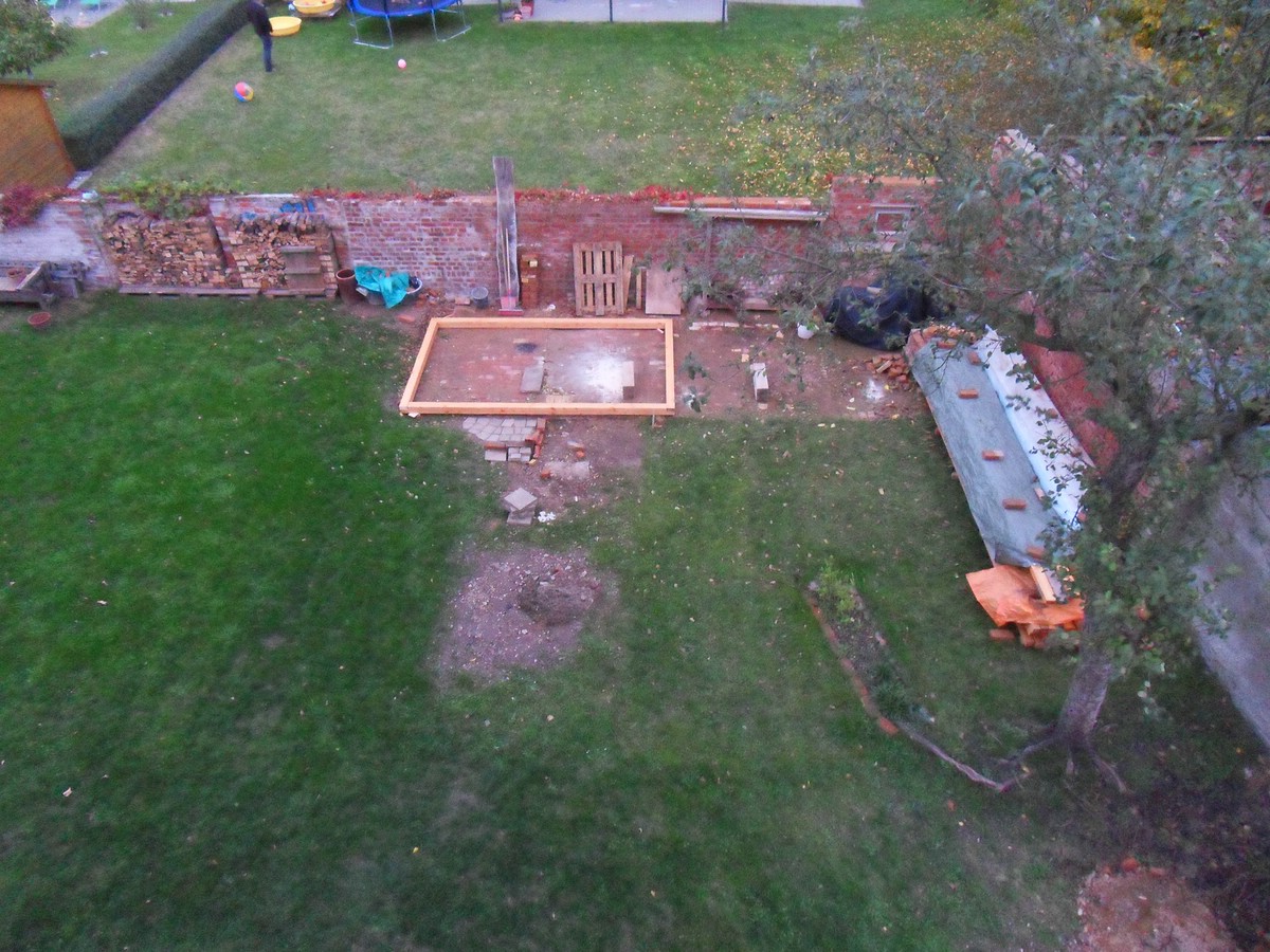 Auf dem Hof ist der zukünftige Schuppen zu erkennen. Dirk hat mir am Samstag beim Aufbau geholfen. Jetzt fehlt noch Dach, Wand und Tür …