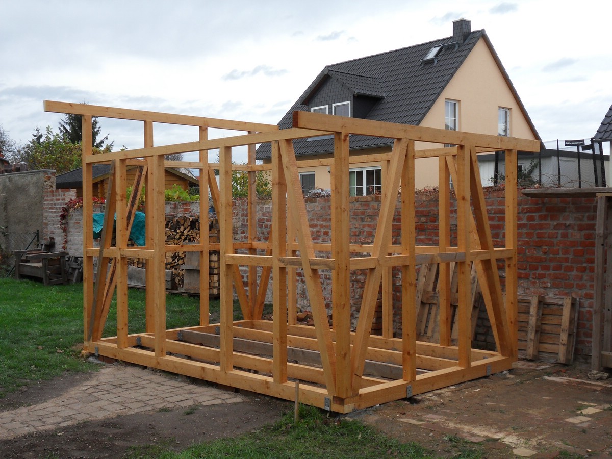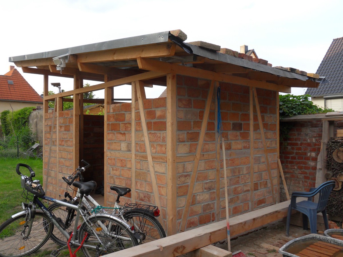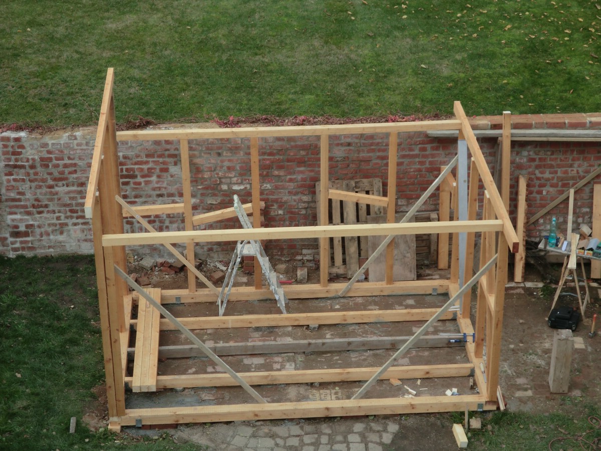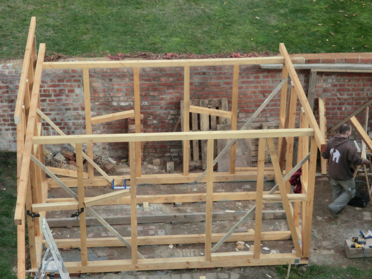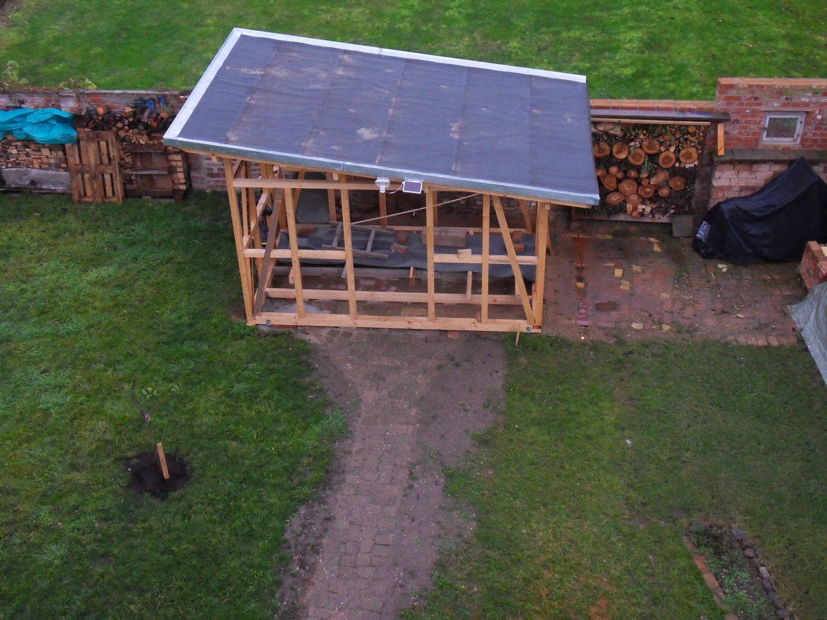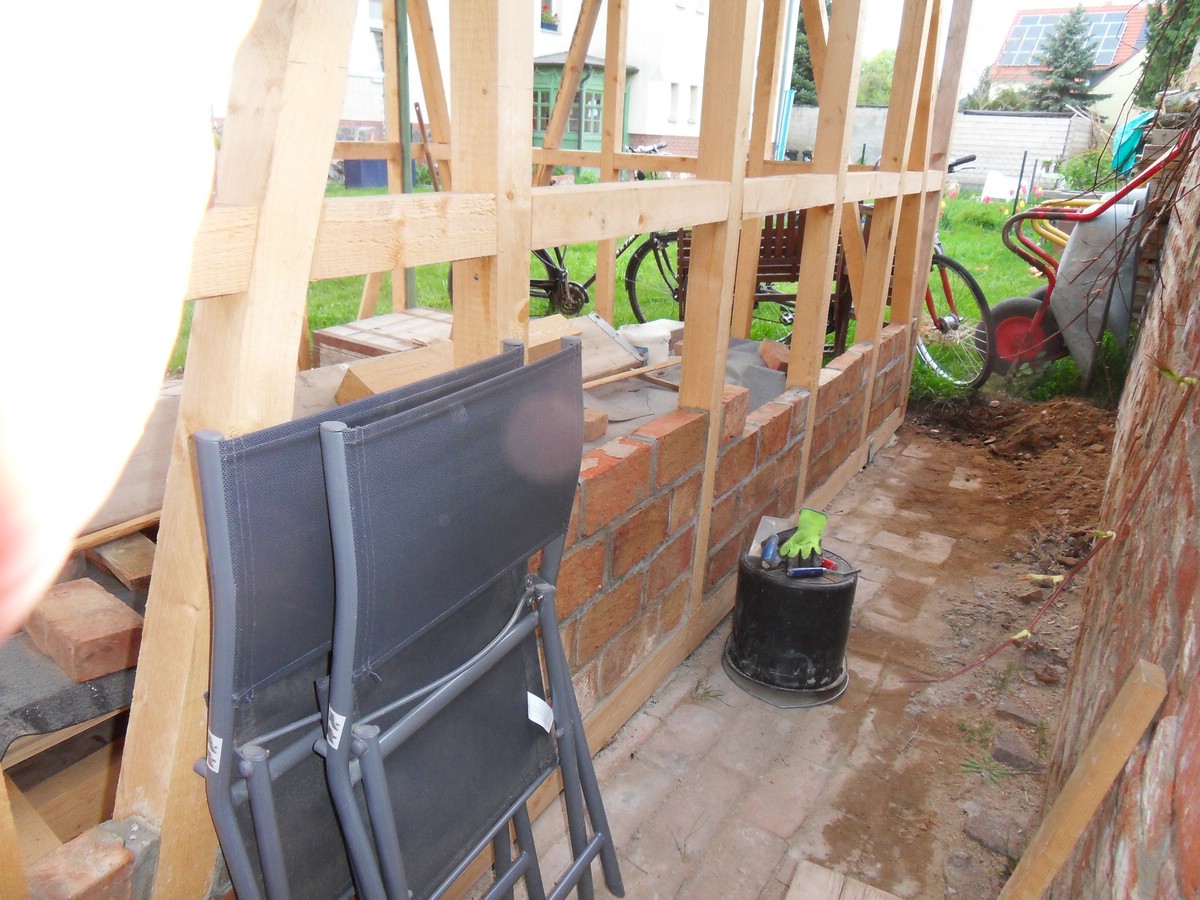 Auf dem Hof ist der zukünftige Schuppen zu erkennen. Dirk hat mir am Samstag beim Aufbau geholfen. Jetzt fehlt noch Dach, Wand und Tür …