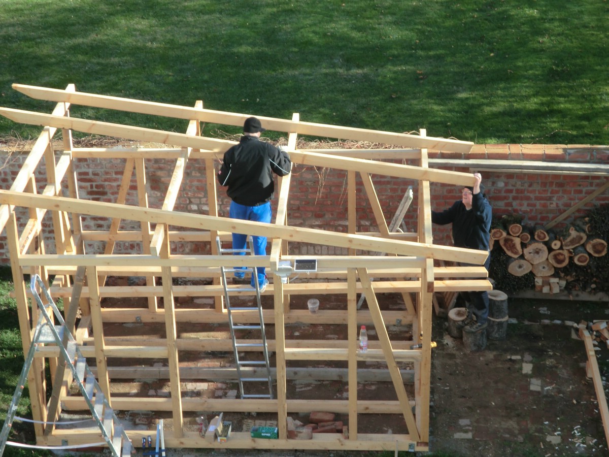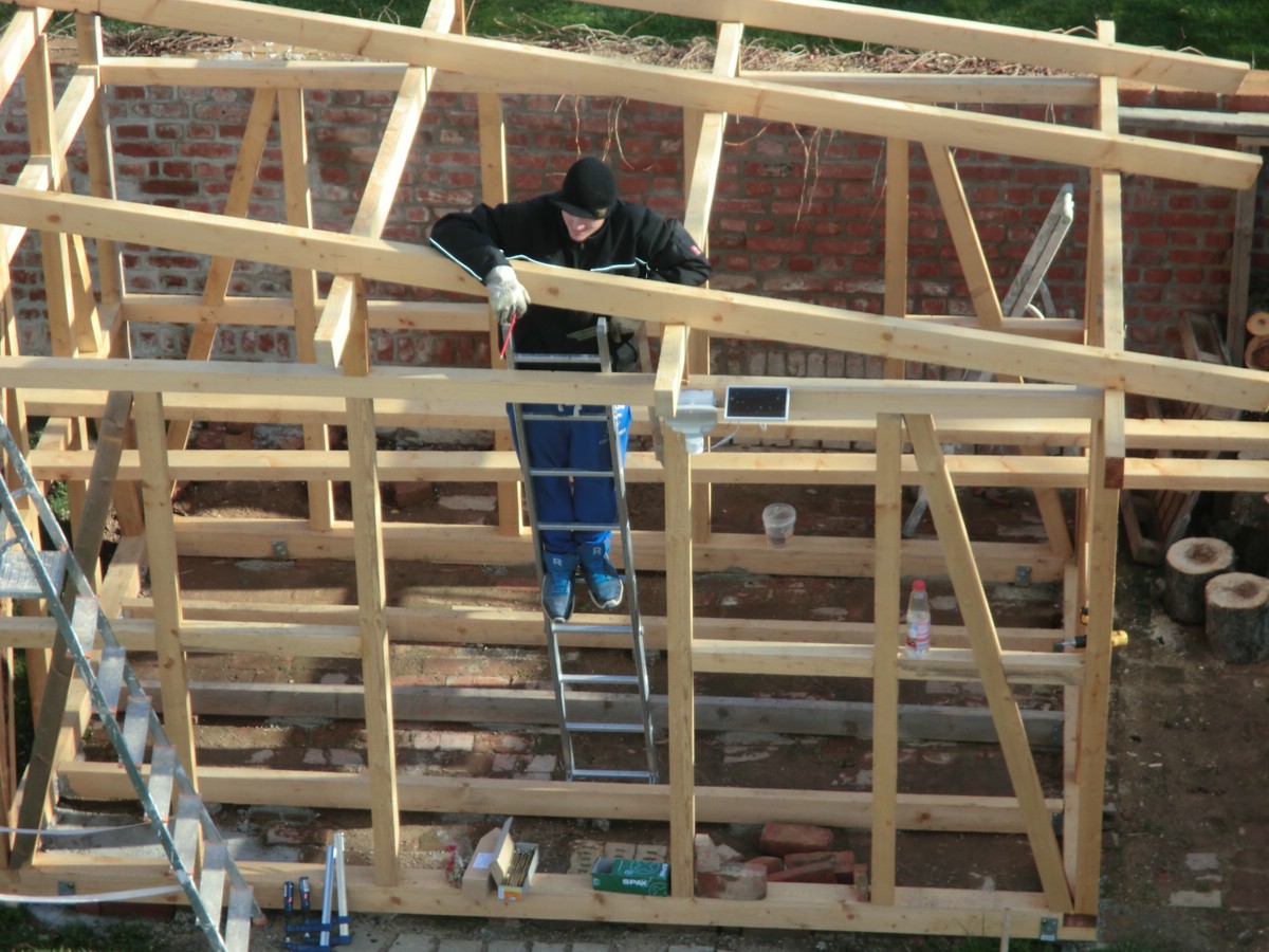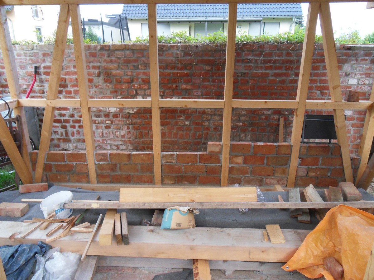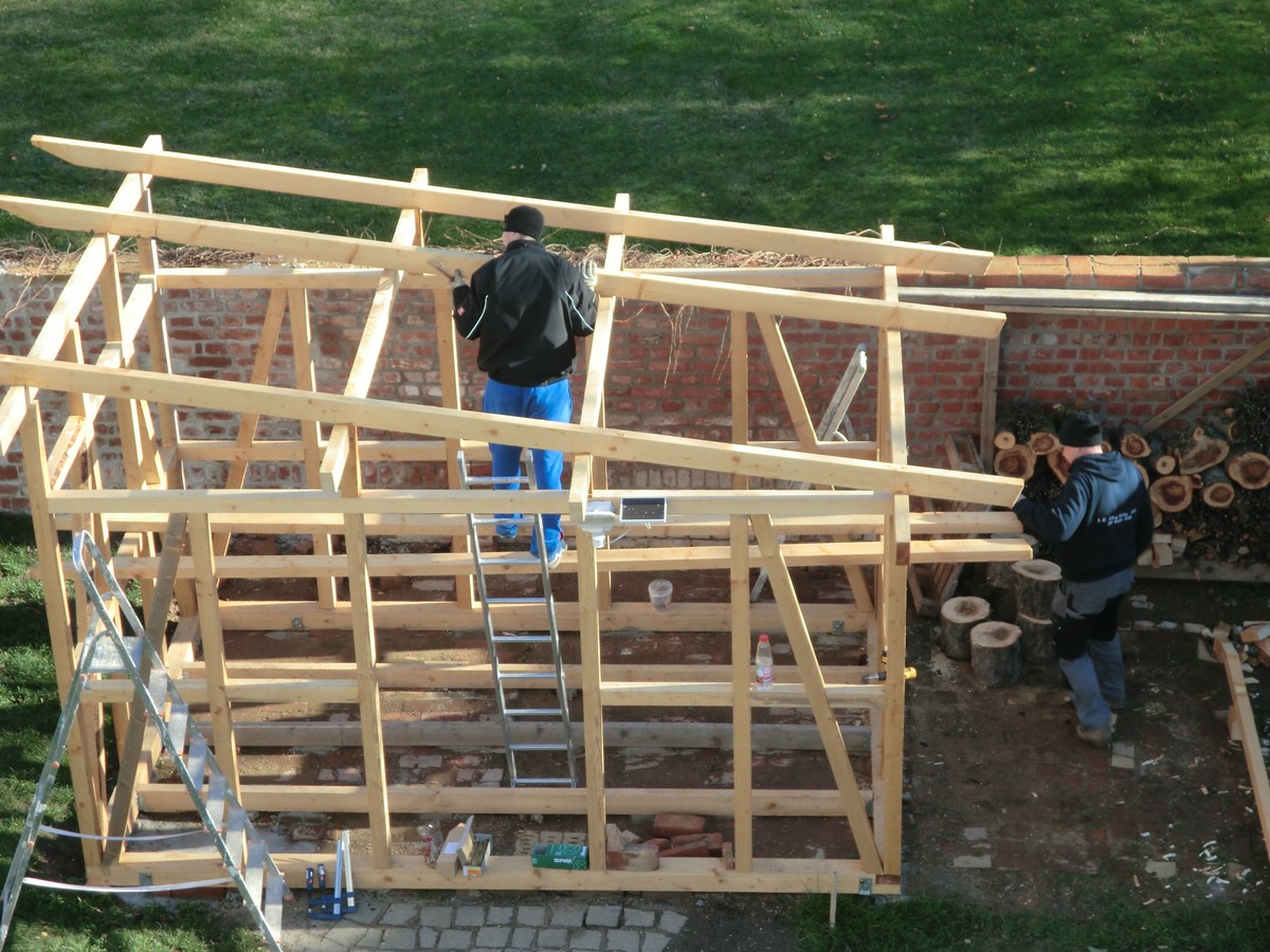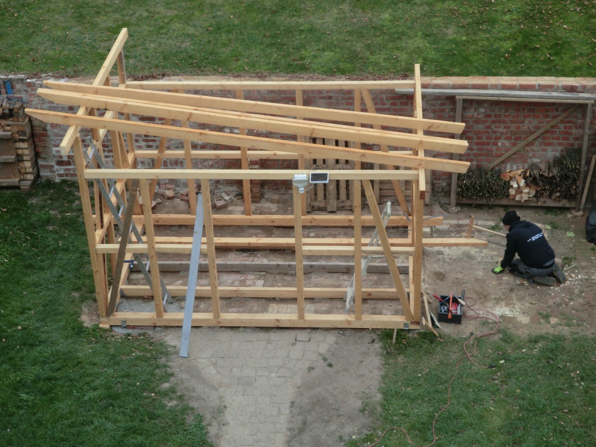 Während Maria Kleinholz gemacht hat, haben Ramon und ich die Dachsparren montiert. Anselm hat mit seinen Kindern die Ersatzpflanznung (Süßkirsche) vorgenommen.