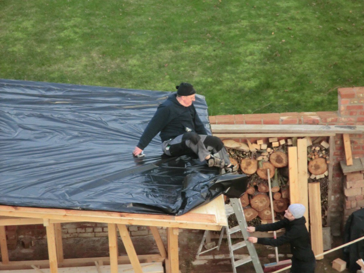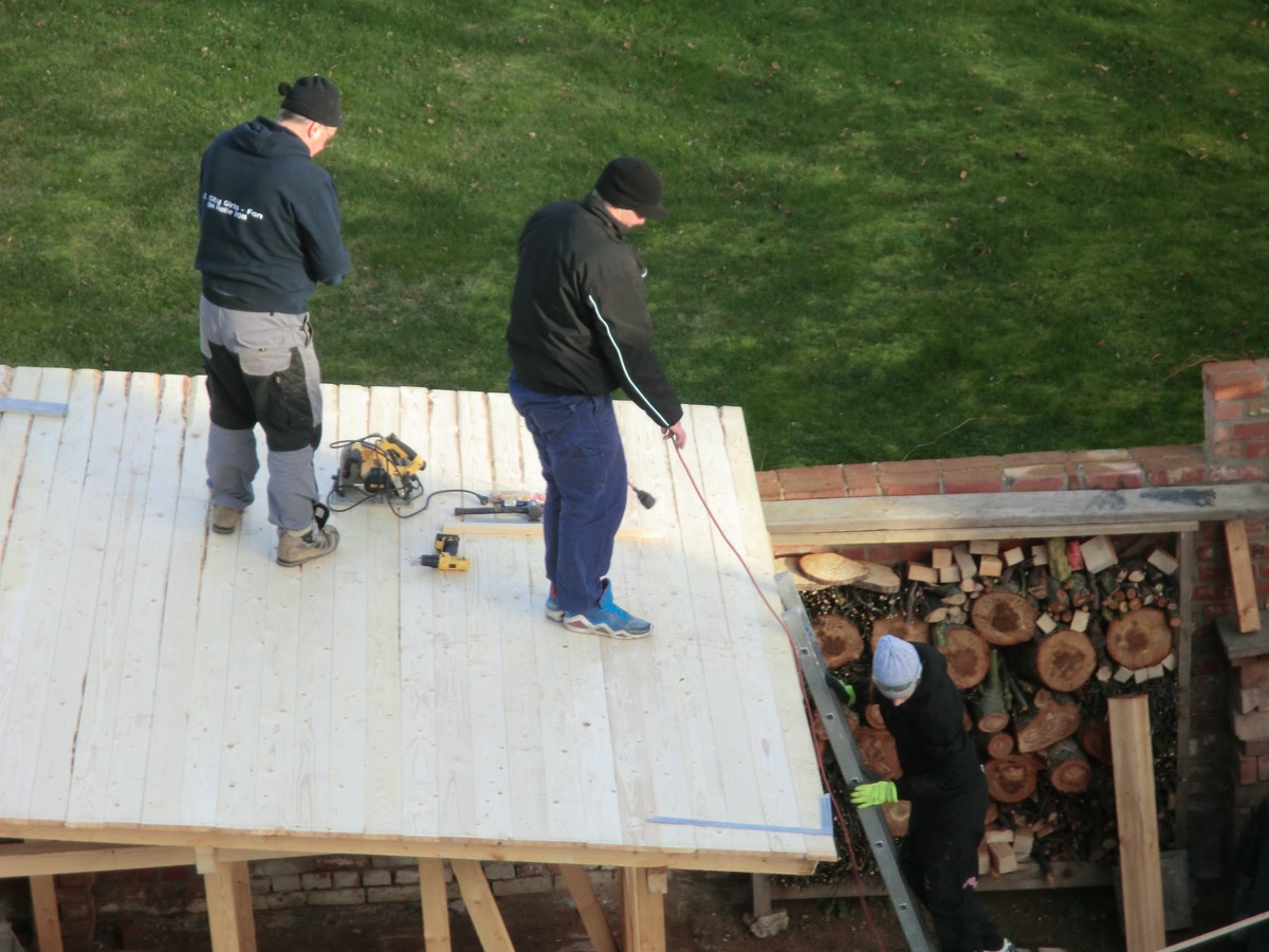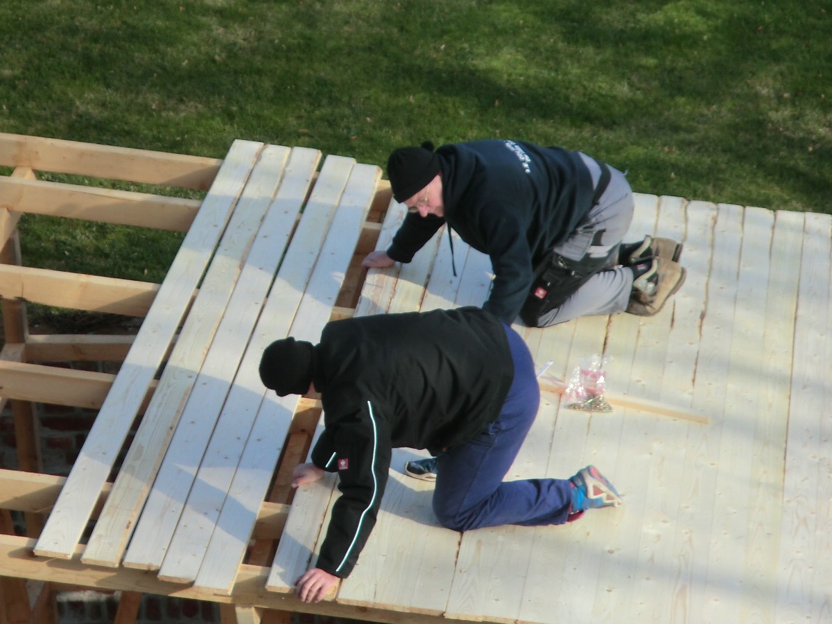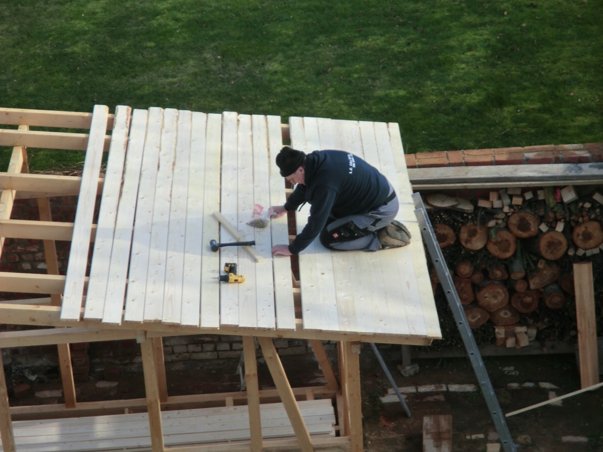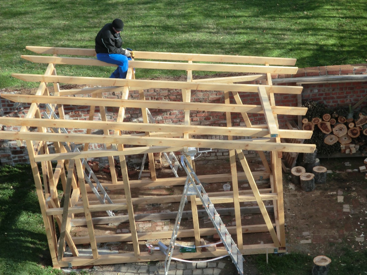 Während Maria Kleinholz gemacht hat, haben Ramon und ich die Dachsparren montiert. Anselm hat mit seinen Kindern die Ersatzpflanznung (Süßkirsche) vorgenommen.