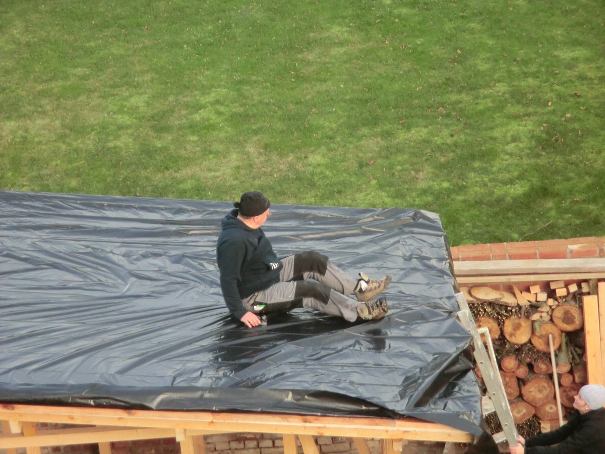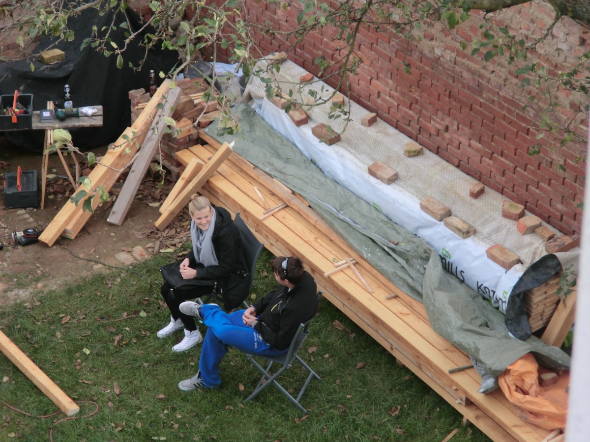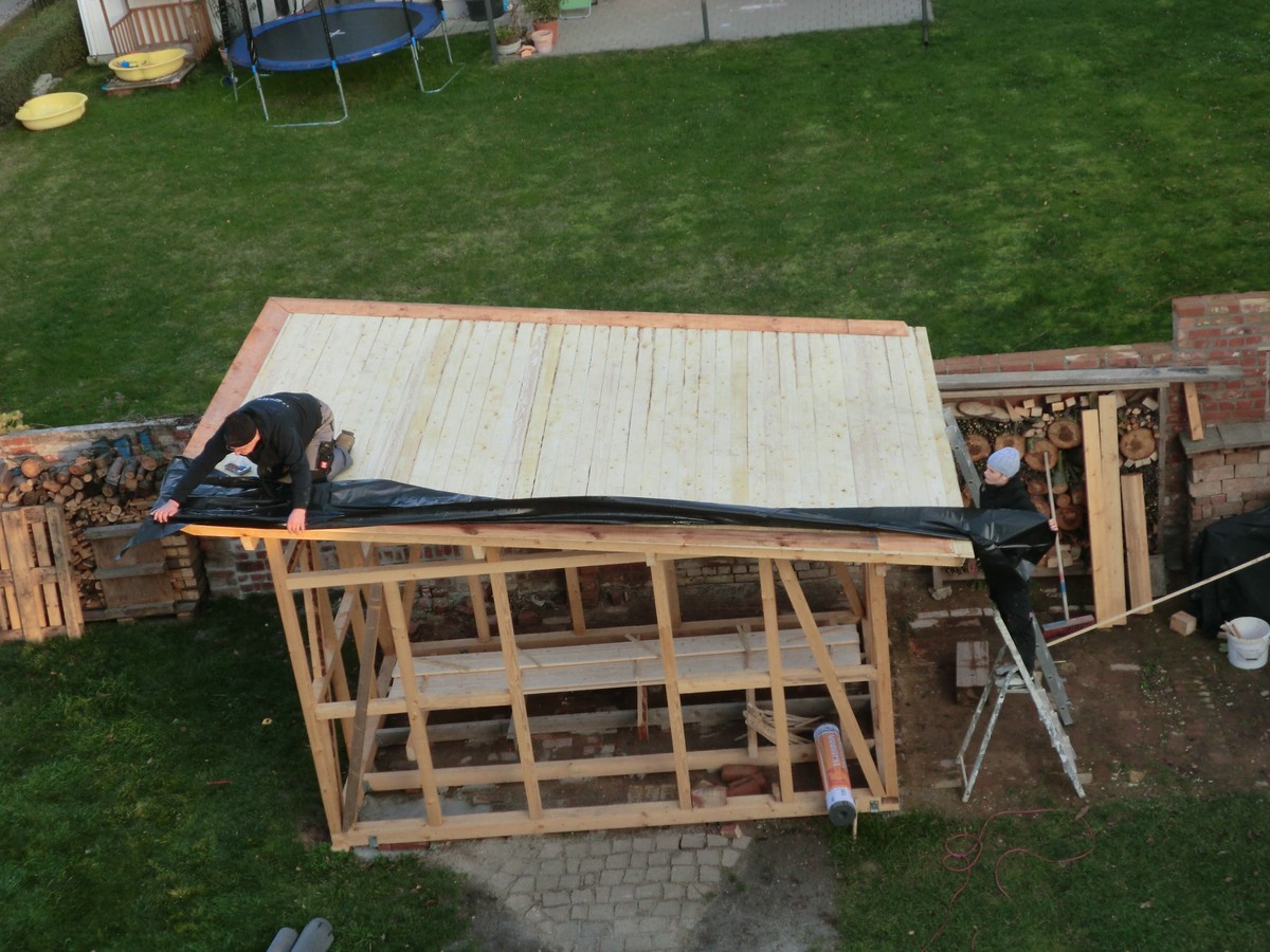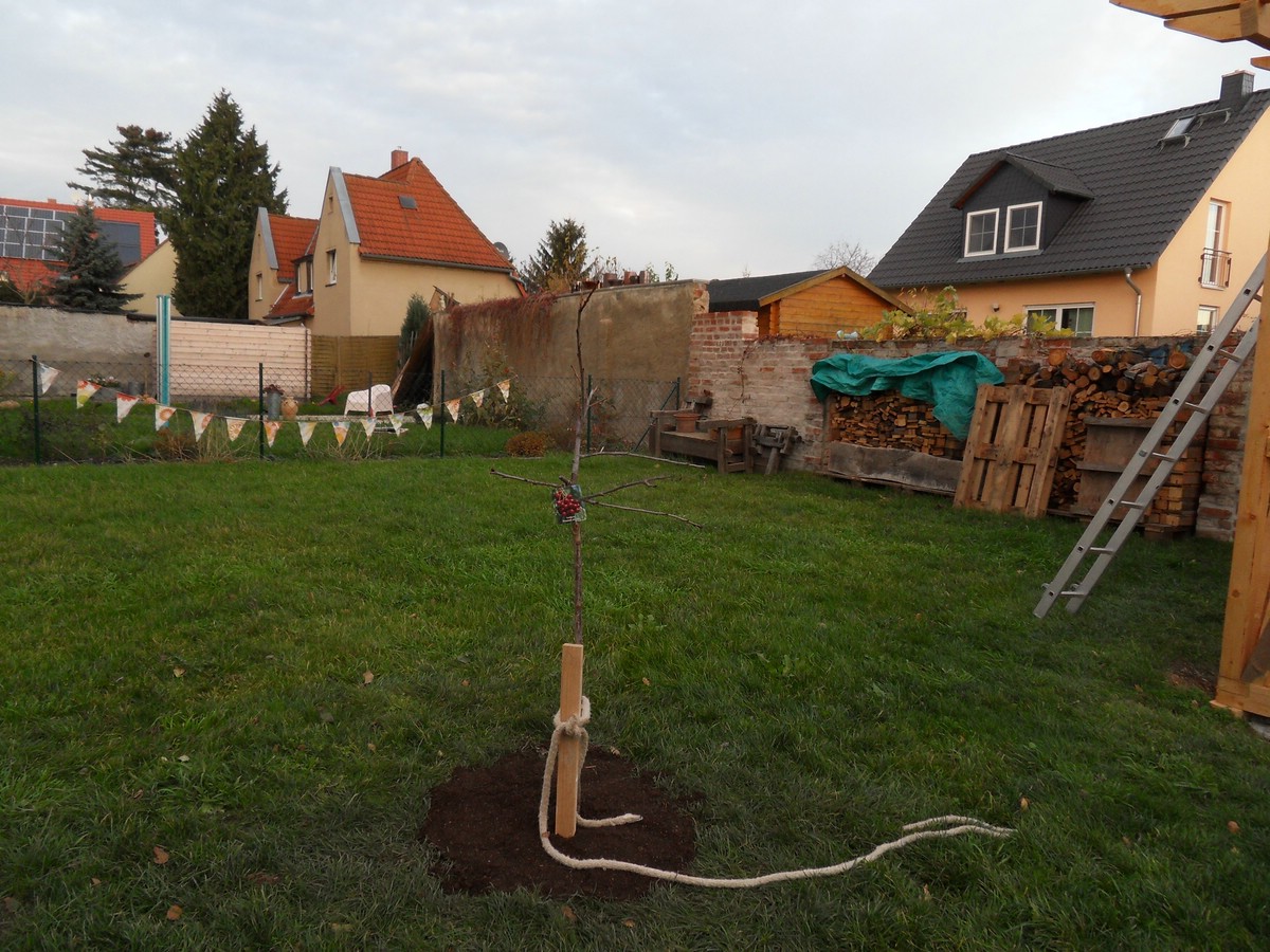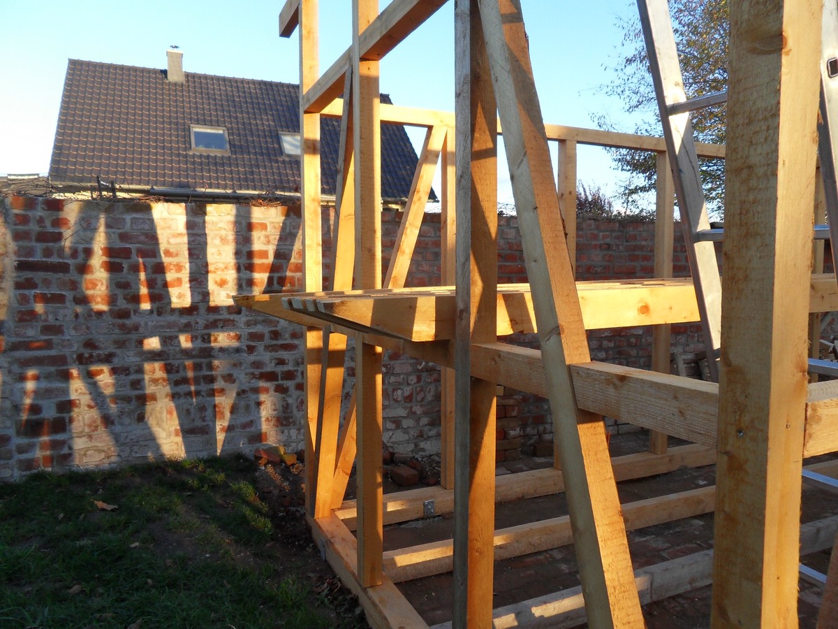 Während Maria Kleinholz gemacht hat, haben Ramon und ich die Dachsparren montiert. Anselm hat mit seinen Kindern die Ersatzpflanznung (Süßkirsche) vorgenommen.