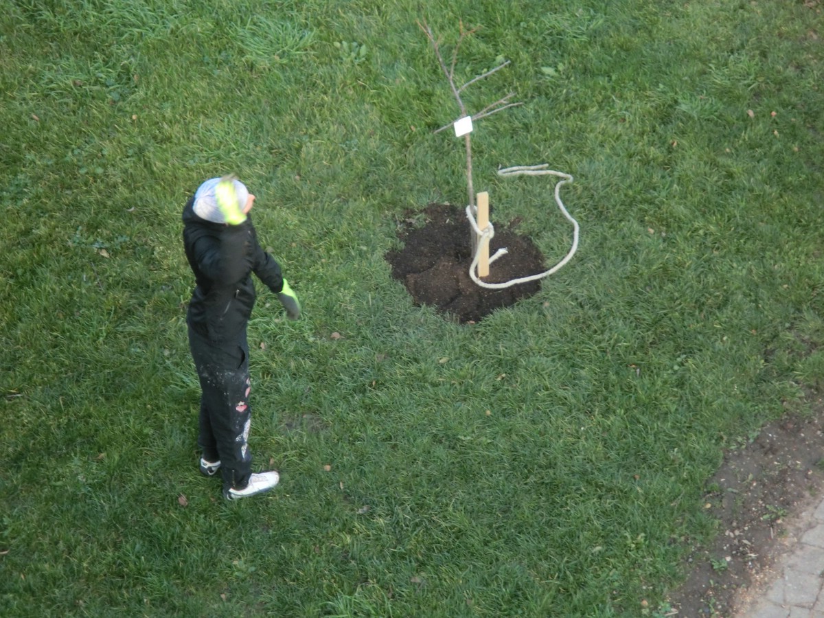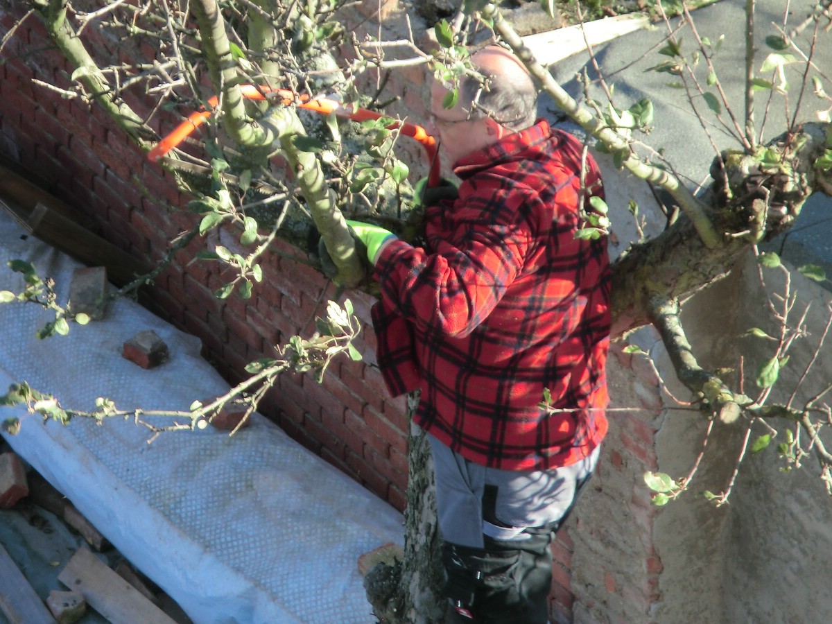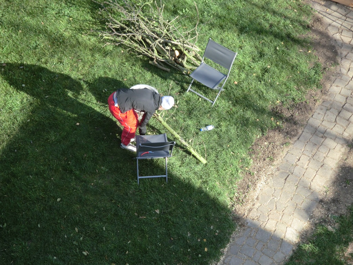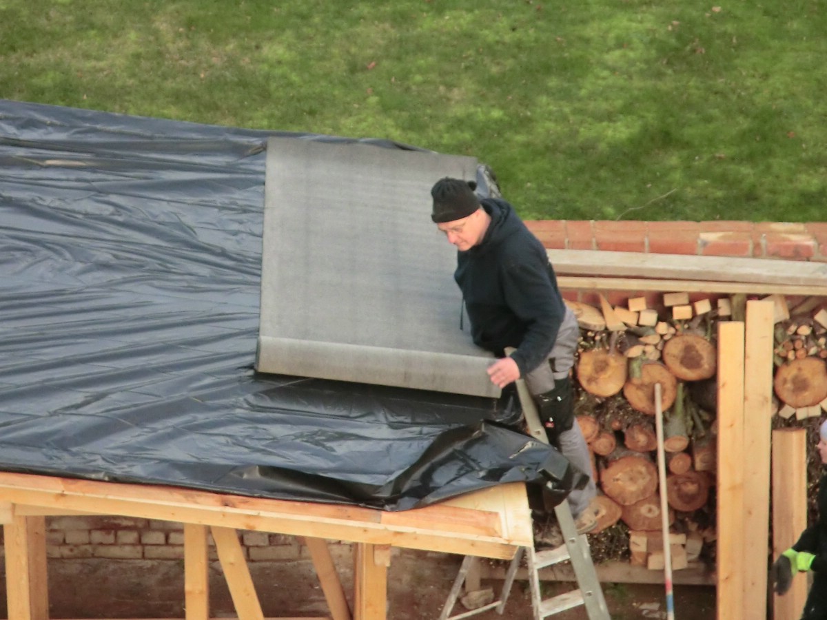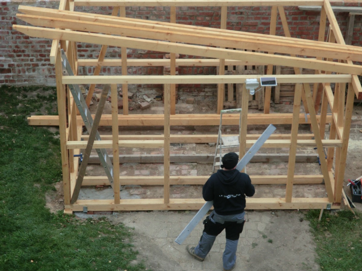Während Maria Kleinholz gemacht hat, haben Ramon und ich die Dachsparren montiert. Anselm hat mit seinen Kindern die Ersatzpflanznung (Süßkirsche) vorgenommen.