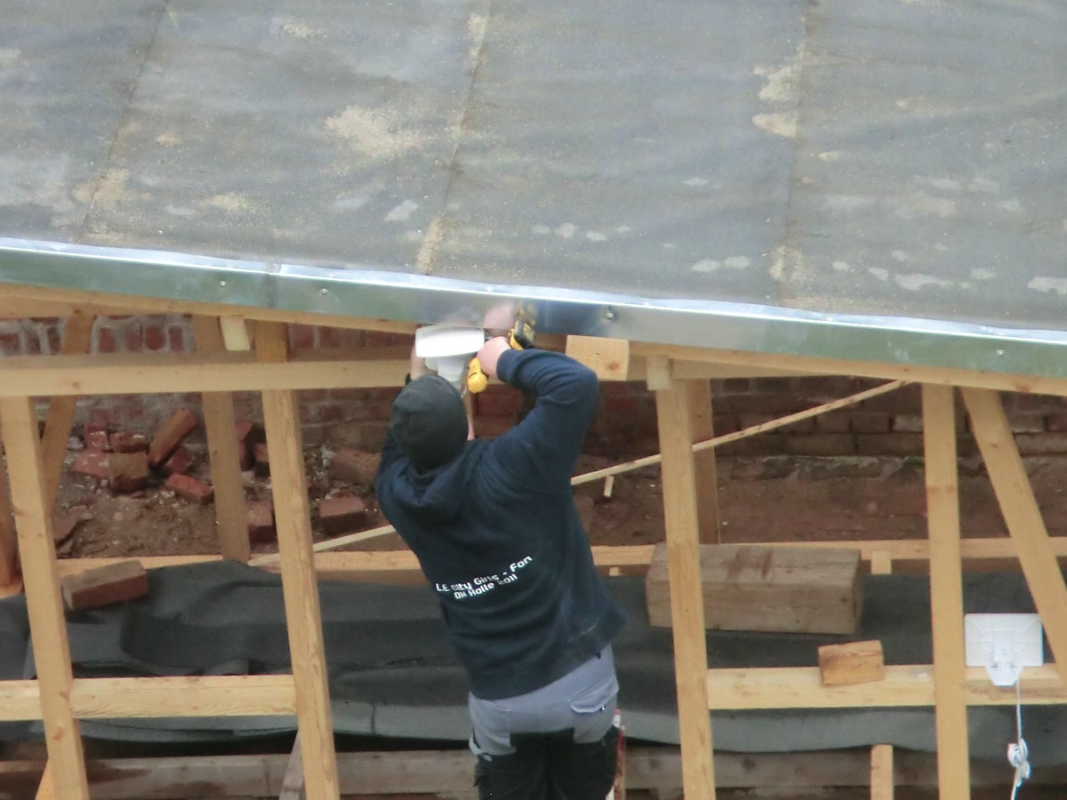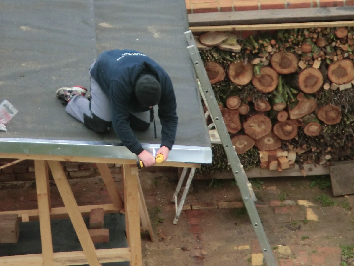 auf unserem Schuppen. Folie, Dachpappe und Ortgang aus Zink. Gut die gelöteten Übergänge sehen nicht so gut aus. Dafür das ich eher selten Löte doch ganz gut. Ob es am Lötzinn liegt?