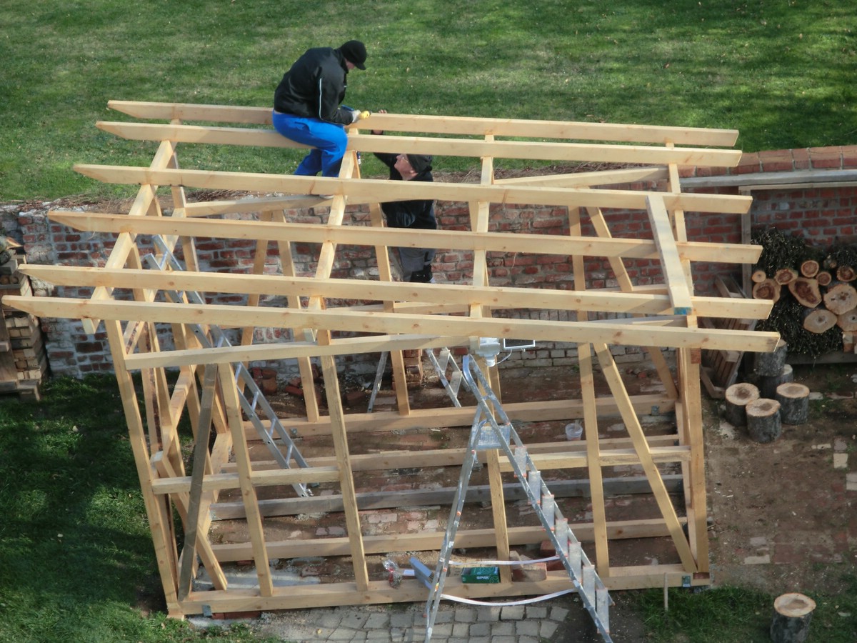 Der Apfelbaum hat schon einige Äste verloren. Die Sparren sind angeschrägt und schon teilweise ausgeklinkt. Ich hab noch zwei Pfetten vorbereitet und Keilbohlen liegen auch schon bereit.