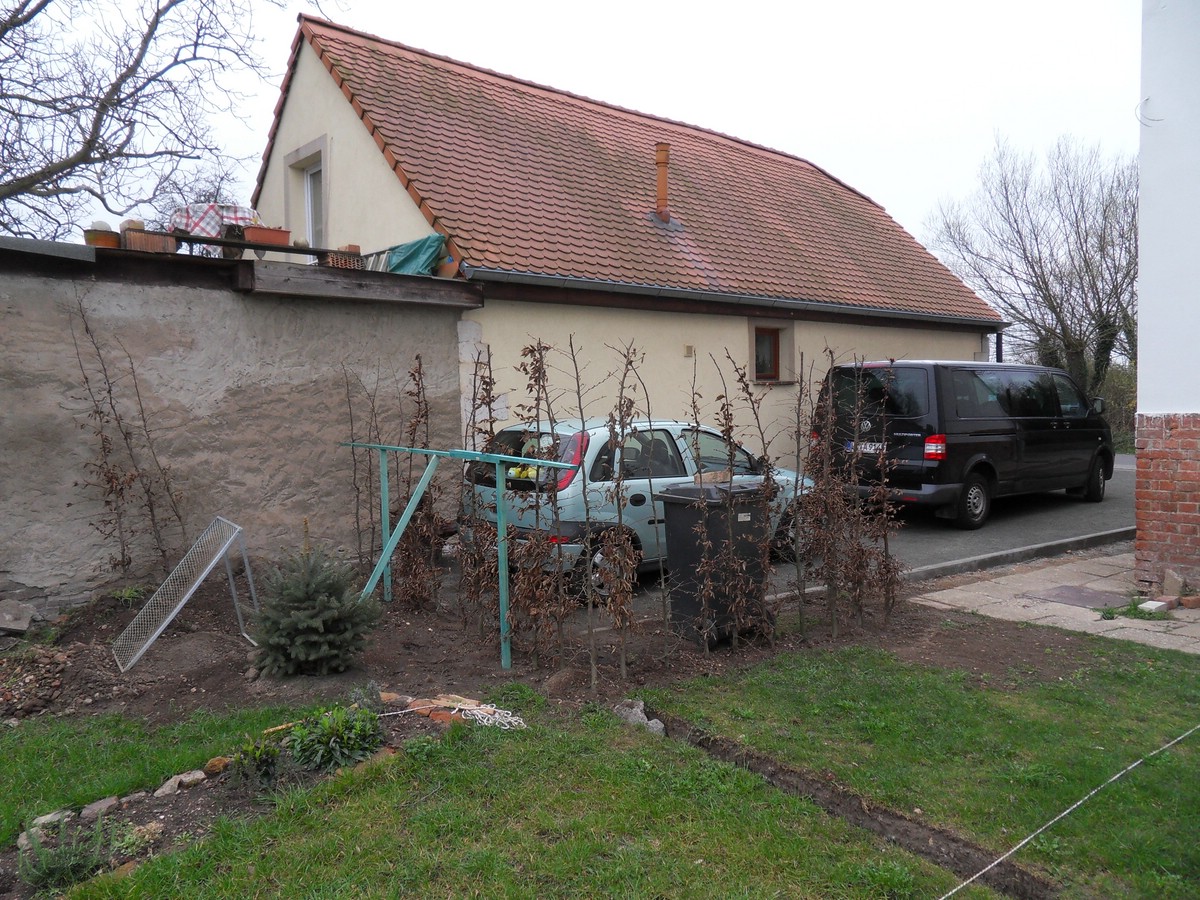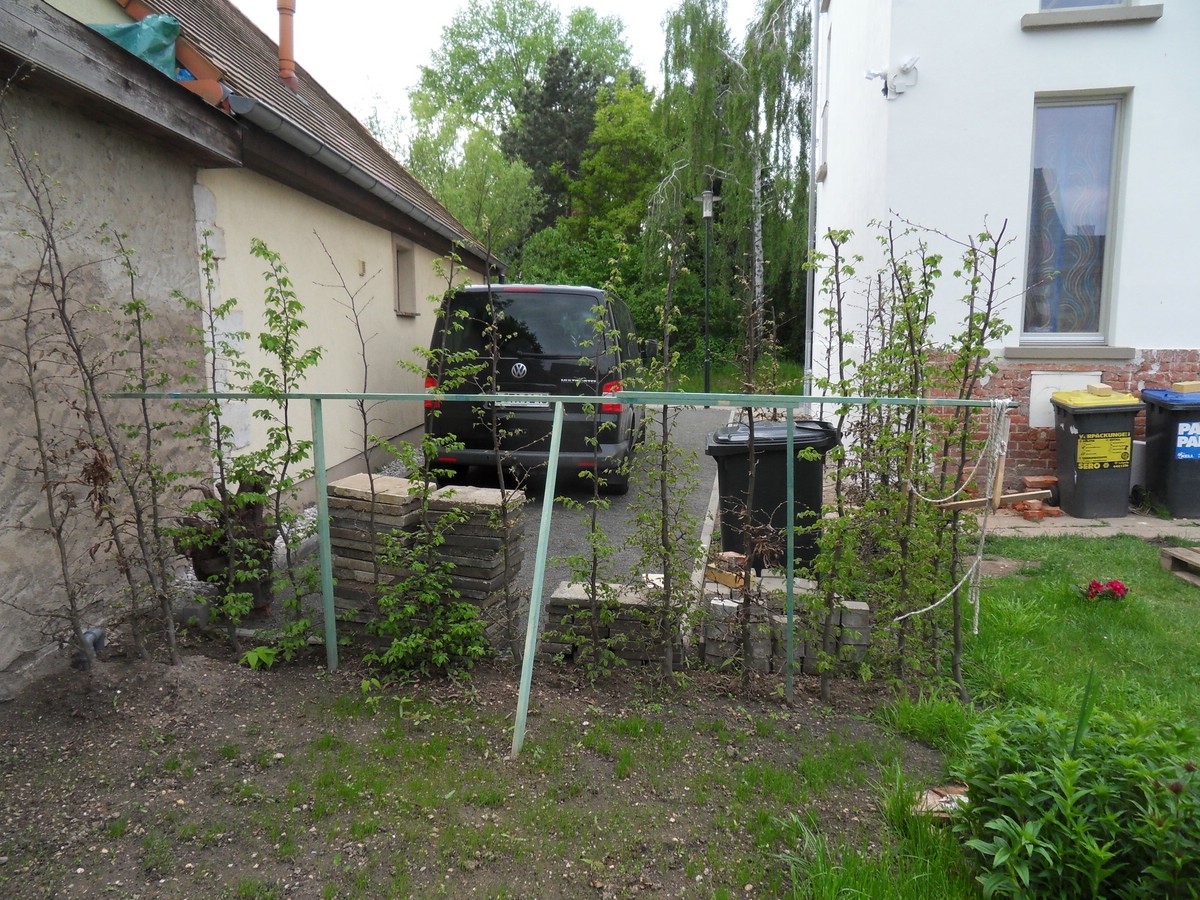 Aber mal in der Reihenfolge. Der hässliche Zählerschrank ist endlich weg. Das Hoflicht leuchtet mit Hilfe des Bewegungsmelders. Die Rückwand am Schuppen wächst, Anselm hat aus Zeitgründen die Sockel verputzen lassen. Die Hecke wird immer grüner, die Kirsche auch.