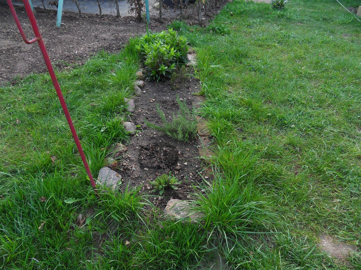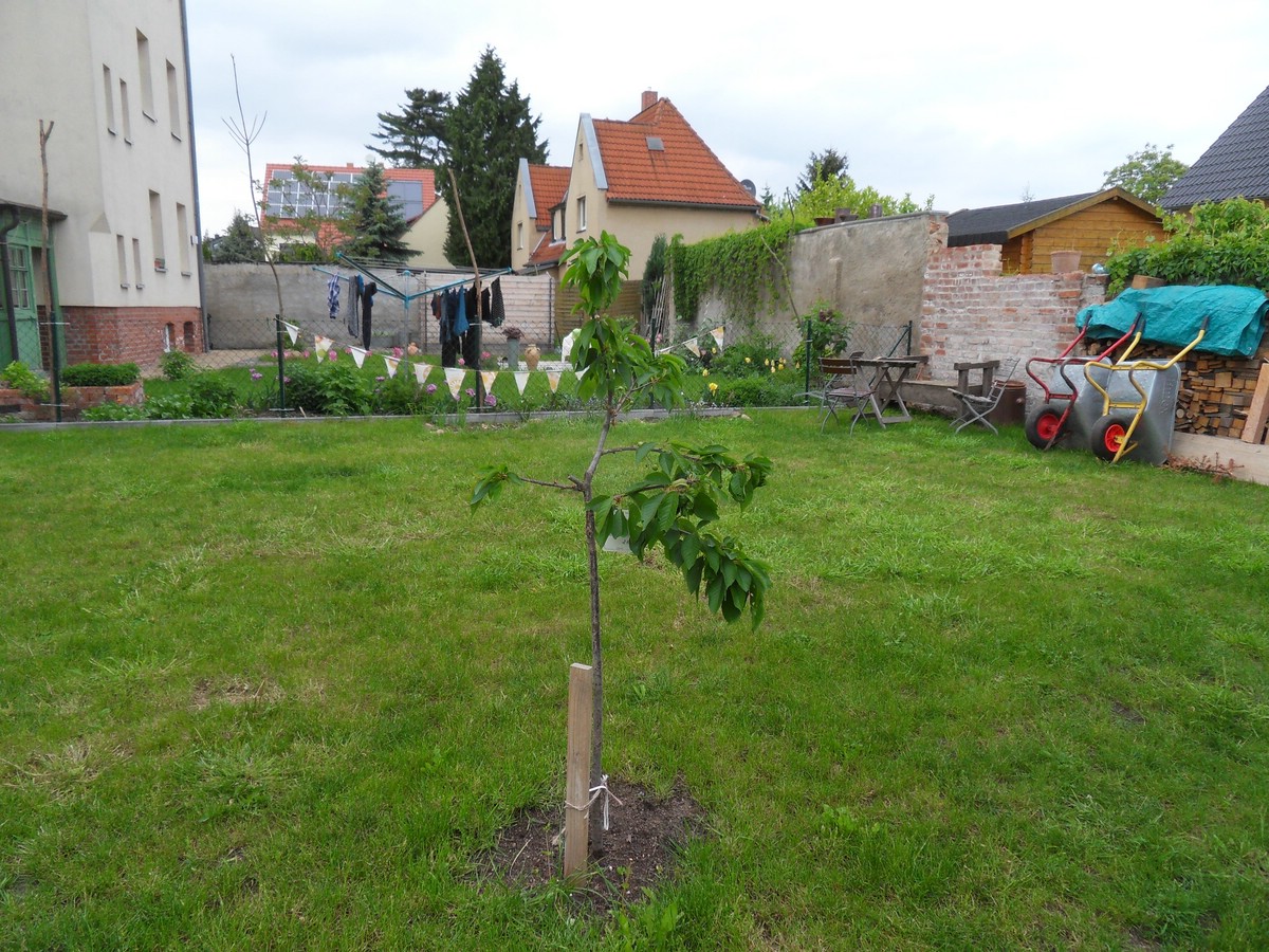 Die Rückwand des Schuppens ist gewachsen. Dank dickem Daumen nicht in der geplanten Zeit. Wenn die Stare nicht zuschlagen, wird es auch schon Kirschen im ersten Jahr geben. Silkes Rhododendron blüht. Bei der Hecke gibt es nur noch zwei Pflanzen die mir richtig Sorgen machen. Im Minibeet wächst es wie verückt. Der Sockel hat nun etwas Farbe abbekommen.