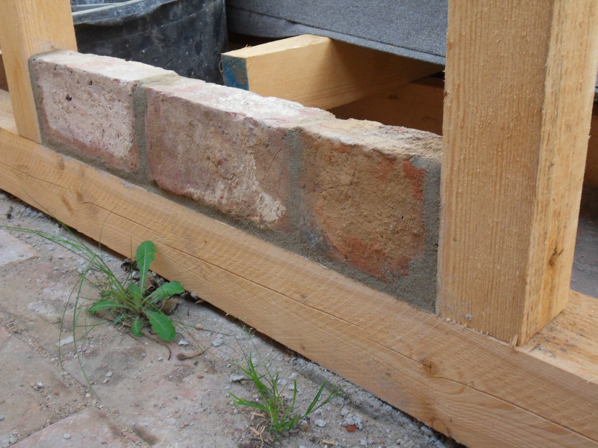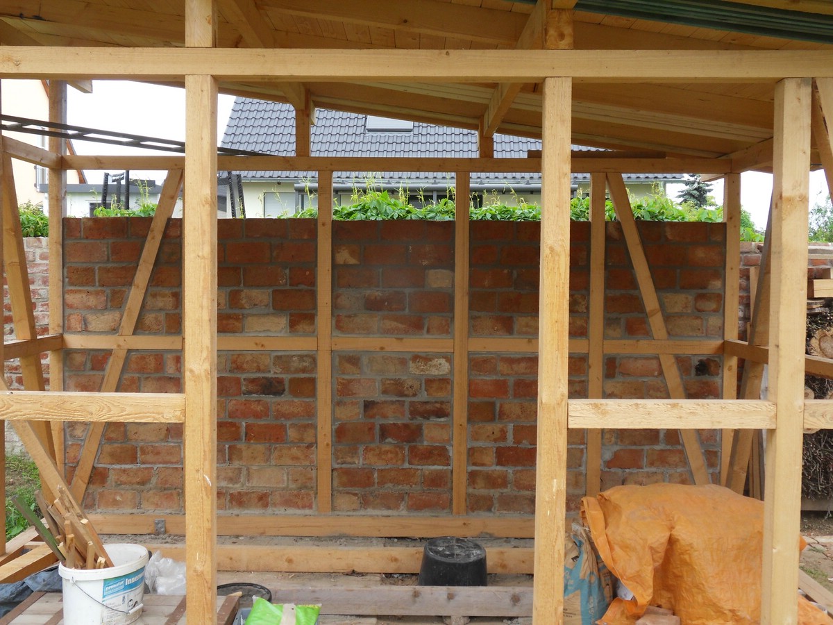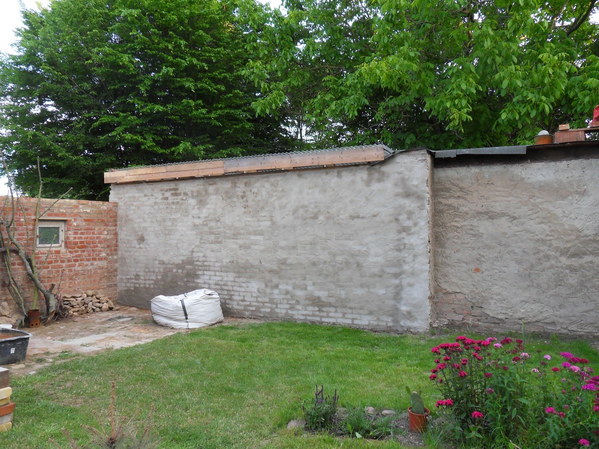 Die erste Probereihe im Schuppen ist ebenfalls gemauert.